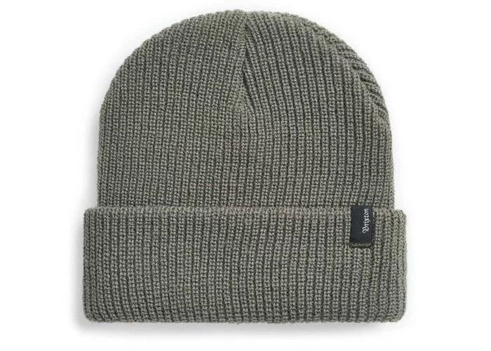 The Heist is a standard acrylic 1×1 rib knit beanie with a Brixton fold label.