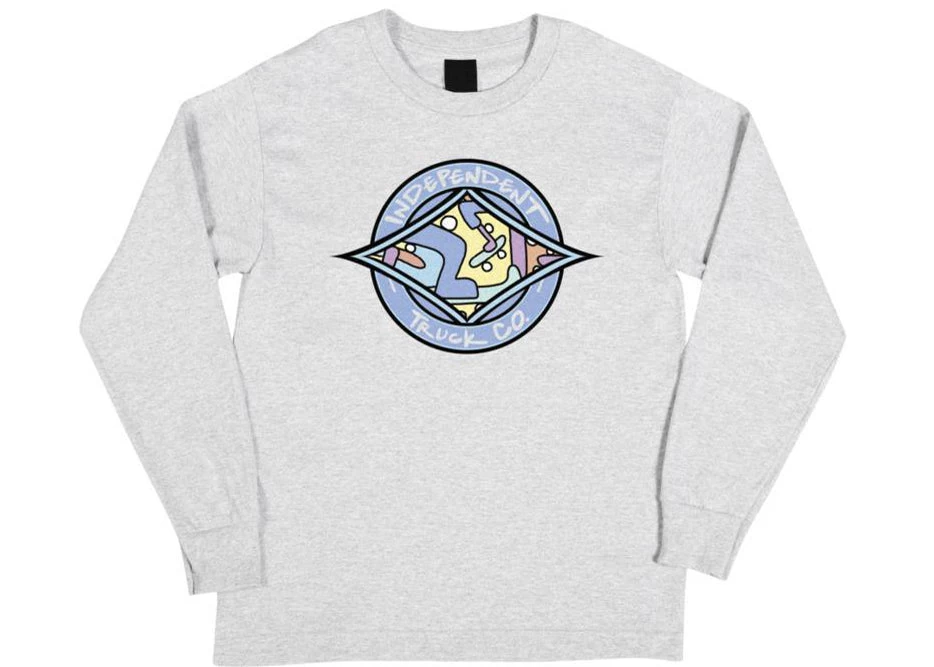 Regular fit youth long sleeve 6 oz. jersey t-shirt wth large Independent Essence soft hand ink front print. Artwork by Sebo Walker.