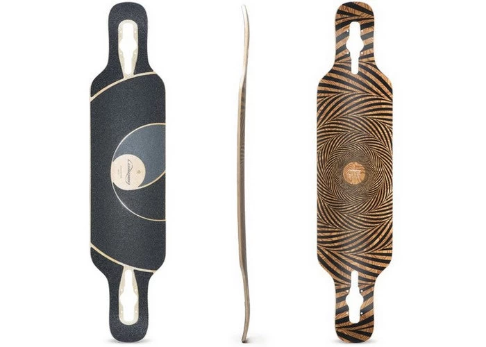 The Tan Tien blends carve-oriented longboarding with advanced trick riding. A flexible deck, drop-through truck mounts and usable kicks allows the Tan Tien to pack a lot into a relatively small package. The complex contours create a super responsive board that allows for increased confidence when leaning into turns, popping tricks, and powering through slides.
