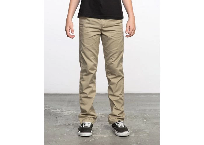 A pant made for days that end in “y”, the RVCA weekday boys stretch pant adds functional movement to a classic chino. An everyday staple that won’t hold you back, the boys chino pant features a zipper fly with RVCA shank button closure, slash pockets at the front and welt pockets at the back.