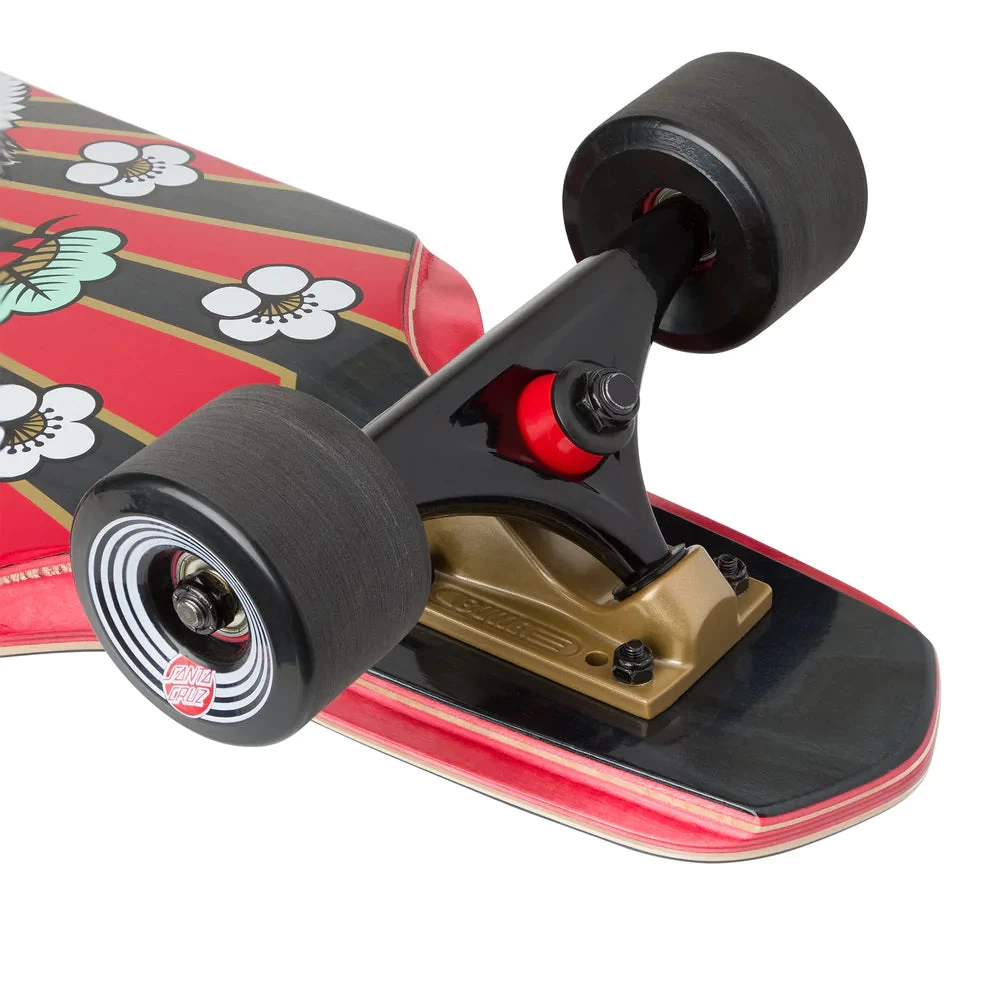 Santa Cruz Skateboards Classic Dot Drop Thru Longboard Cruzer featuring medium sized drop through shaped 9 ply deck with Bullet 180mm reverse kingpin downhill trucks and 66mm 78a Santa Cruz branded Slime Balls wheels.