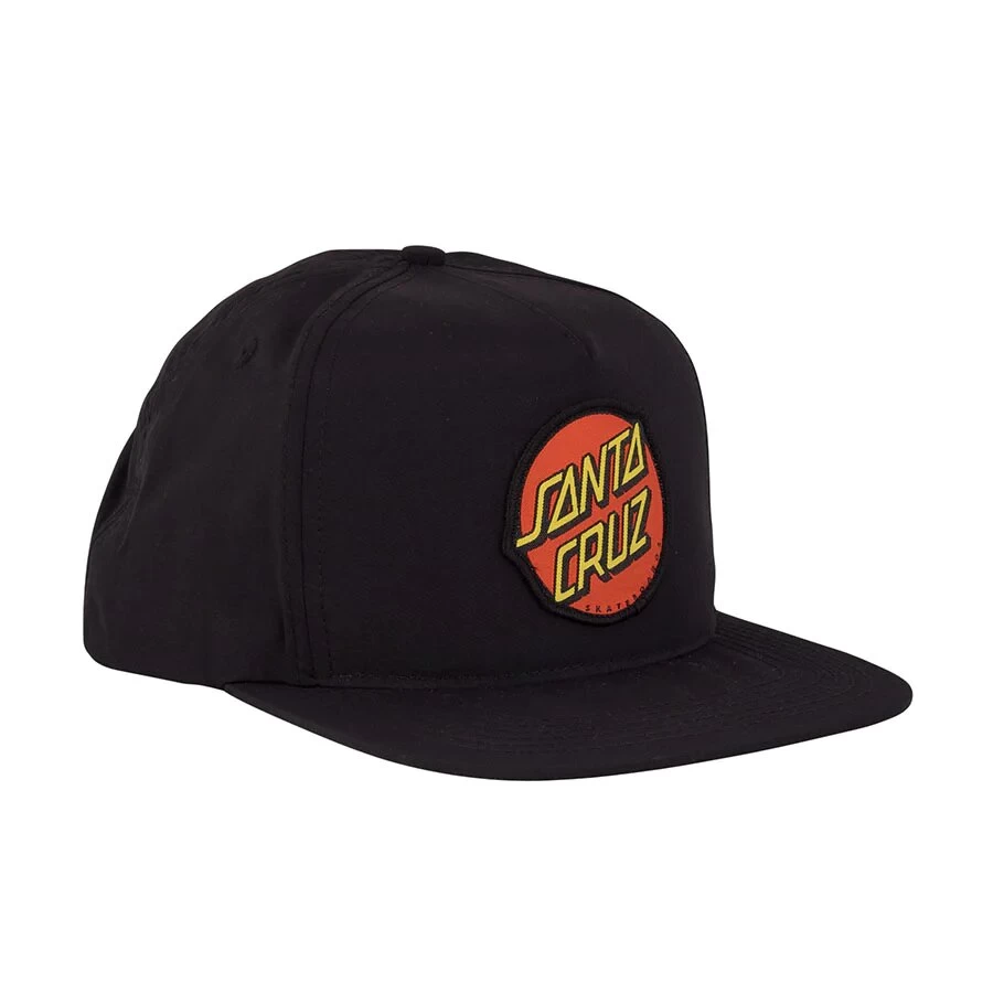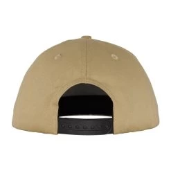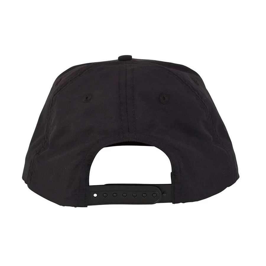 5 panel mid profile snapback adjustable hat with front woven label patch.