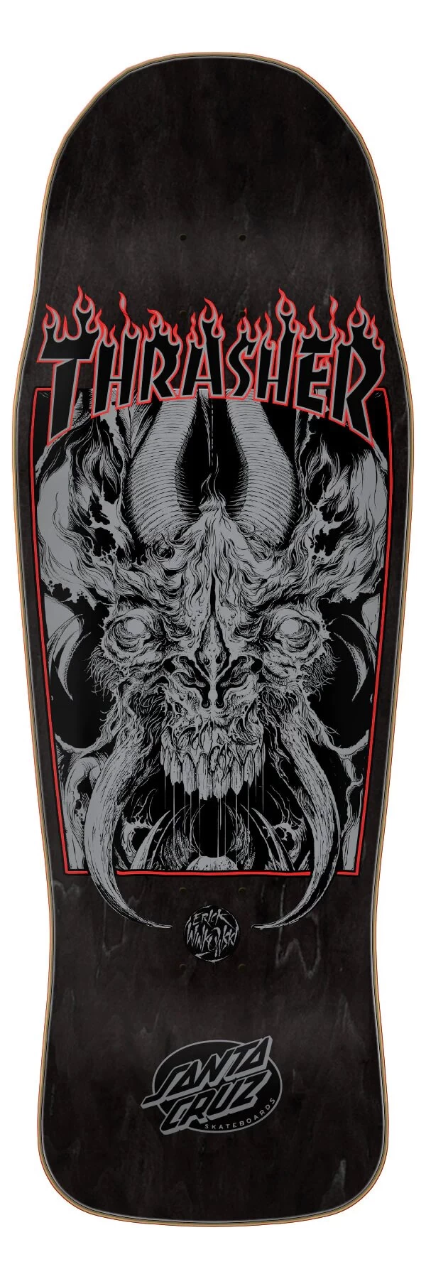 Santa Cruz Skateboards X Thrasher Magazine Erick Winkowski Primeval deck featuring spot spot matte graphics with metallic silver ink on Erick’s OG shape.