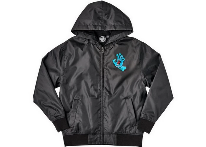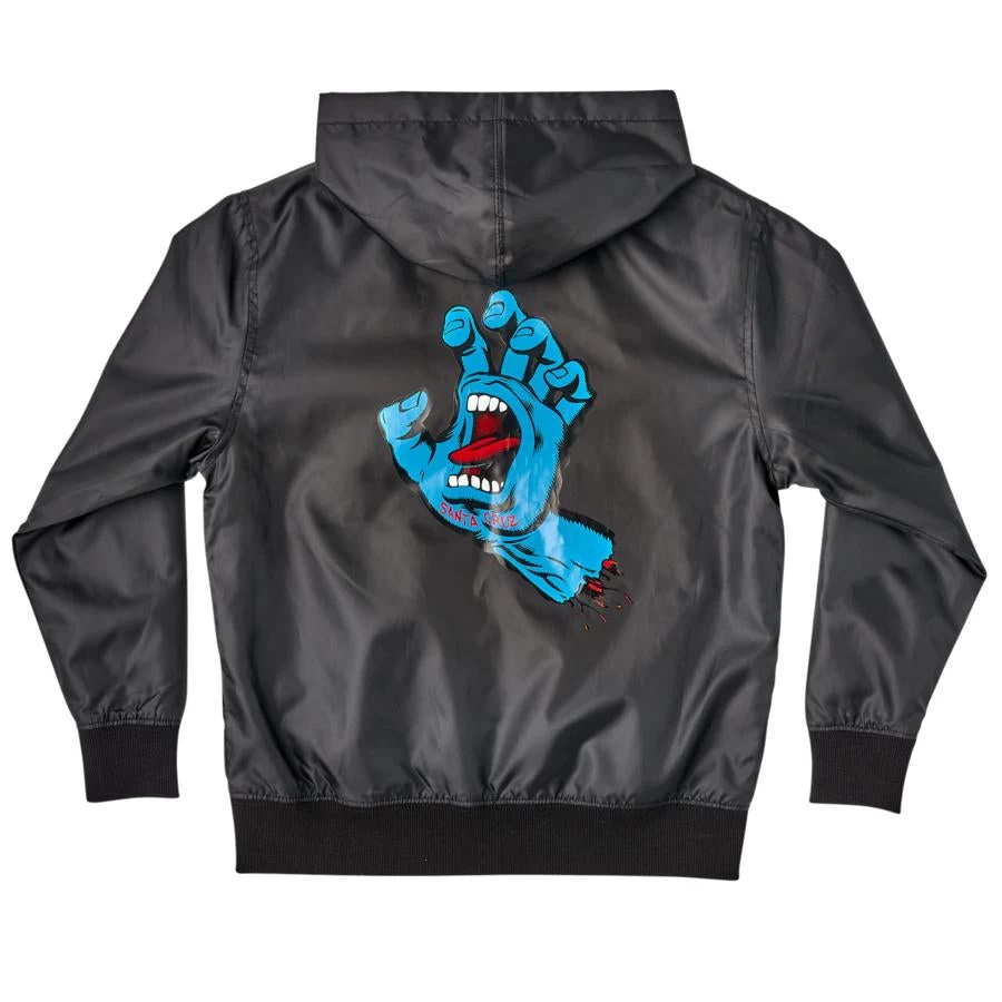 Roll up and stand out in the latest youth jackets and apparel from Santa Cruz Skateboards. The new Screaming Hand youth regular fit, zip hooded windbreaker features contrast color lining, front welt hand pockets, tricot body lining and front and back Santa Cruz Screaming Hand prints. Artwork by the legendary Jim Phillips. Santa Cruz has been manufacturing the best skateboards and apparel since 1973. Innovative skateboards apparel and artwork from the beginning ‘Til the End.