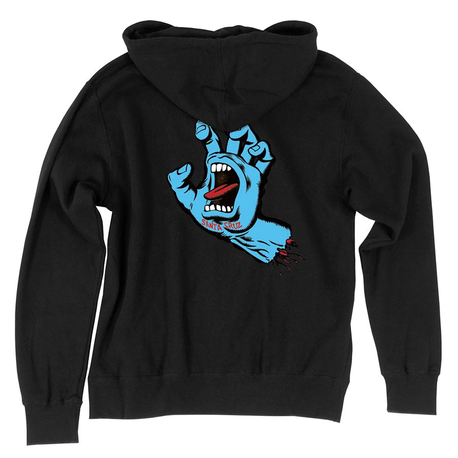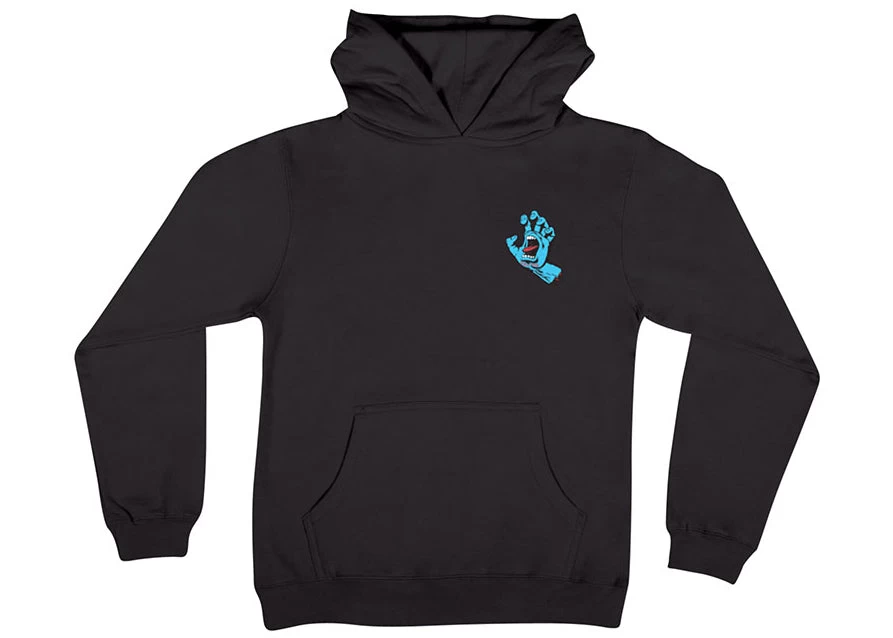 Youth pullover hooded sweatshirt in midweight 8.5 oz. fleece with a small front and large back Jim Phillips Screaming Hand prints.