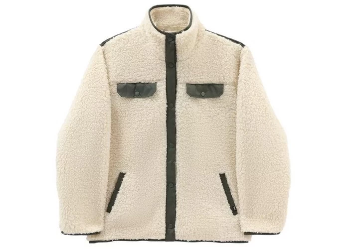 The Dreaming Sherpa Jacket is a 100% polyester oversized Sherpa jacket with a solid colour and contrasting bindings and plackets. This cozy, lined jacket has a high neck, a snap front closure, welt pockets at the hips, and flap patch pockets at the chest.