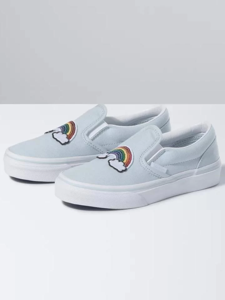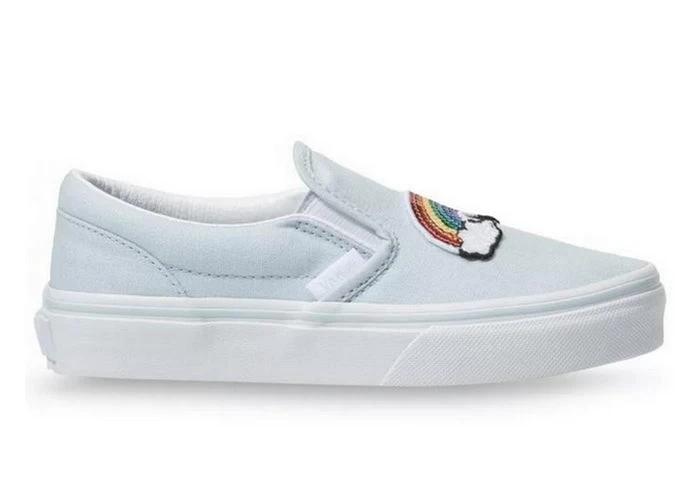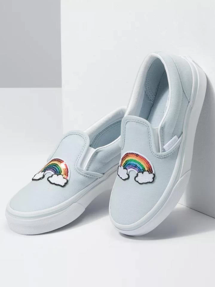 The Kids Sequin Patch Classic Slip-On features sturdy low profile slip-on canvas uppers with sequin patches at the front, padded collars, elastic side accents, and signature rubber waffle outsoles.