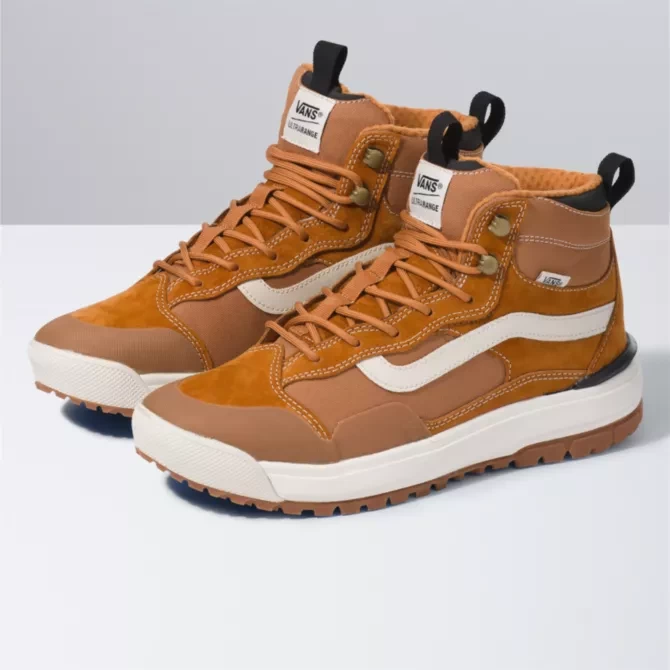 We believe adventure begins when things go sideways, so we developed a shoe that would not only stand up to the journey, but keep you comfortable in the most uncomfortable of situations. Armed with additions designed for the elements, the UltraRange EXO Hi MTE features leather, textile, and synthetic uppers with MTE details, warm linings, and a revamped rubber toe and forefoot shape to provide an optimal fit without sacrificing Vans design DNA. In addition, our redesigned co-molded outsole with a reverse lug waffle pattern is built to maximize rubber coverage, grip, and durability while maintaining lightweight versatility, and the all-new, full-length UltraCush Lite midsole combines featherweight comfort with complete support. This is the UltraRange-evolved.