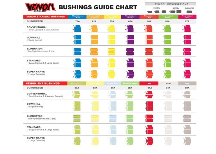 | Venom standard downhill | 73a pastel pink, 78a blue, 81a orange, 85a yellow, 87a purple, 90a red, 93a green, 95a glow in the dark, 97a pink |